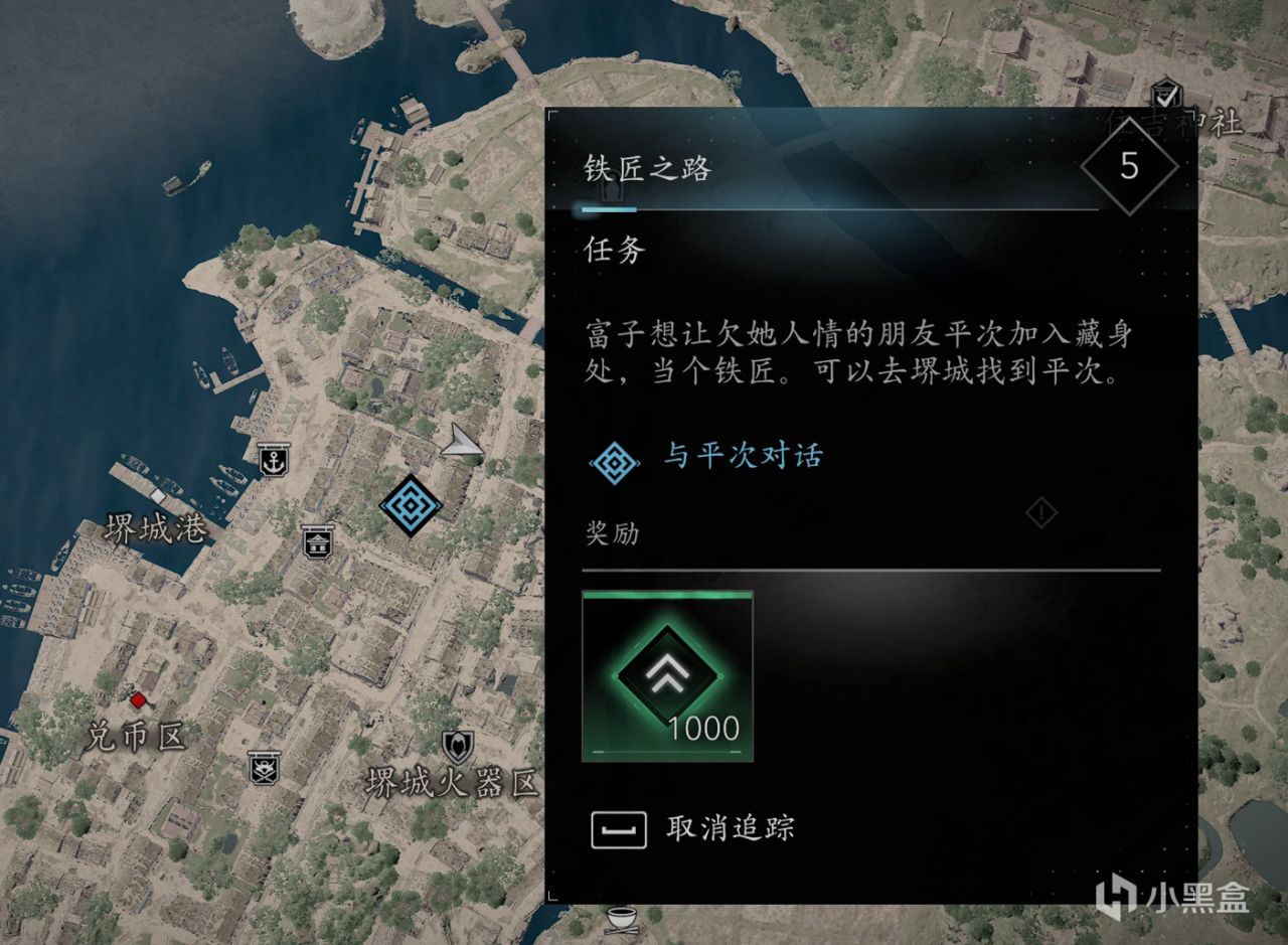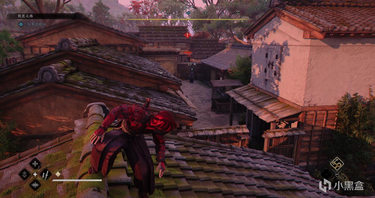上房顶观察,对面蓝点就是我们要找的铁匠平次,接下来我们清理杂兵,和平次对话。他告诉我们,他的父母经营了很有名一家铁匠铺,但是父母都被杀了,说实话平次让我想到了KCD里面的亨利,育碧真不如直接扶正平次当个男主。