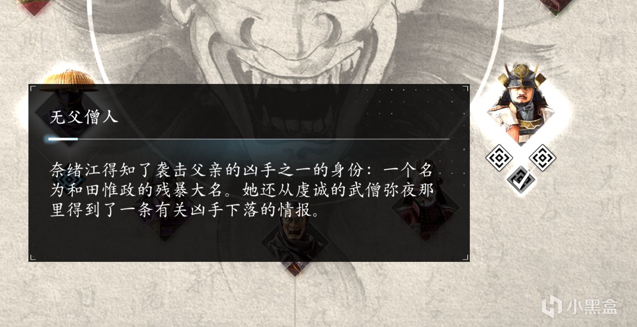 一位蒙面武士偷袭将我们打倒,争抢盒子的过程中,武士的面具被我们摘下,成为重要线索。
