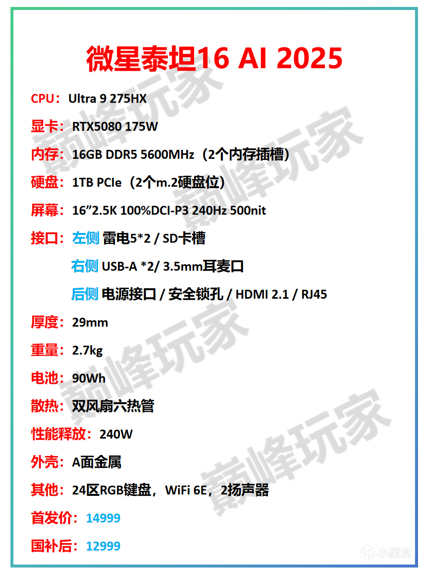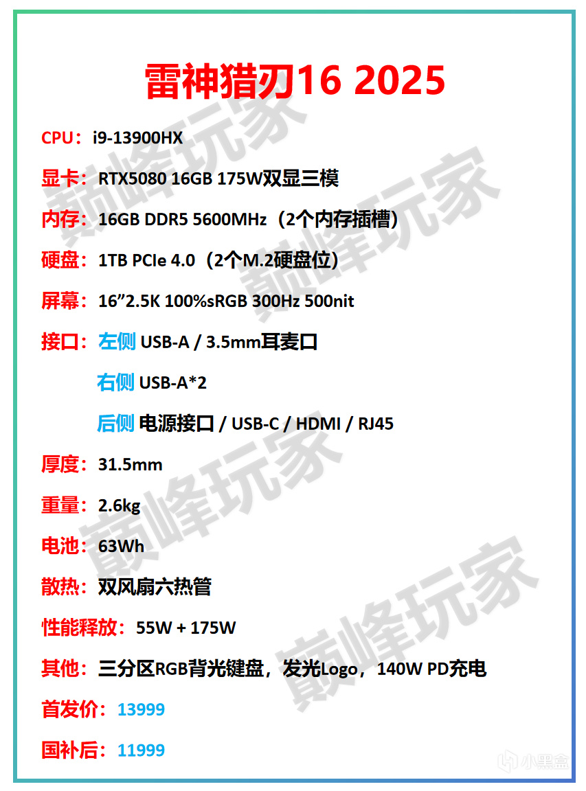 模具和雷神猎刃16 2025一样,应该是广达供应,标配32GB内存+1TB SSD以及WiFi 7无线网卡(估计是BE200),从模具纸面素质来看,这显然是入门级旗舰公模了。把有限的成本预算差不多都投入到了GPU上,这也就意味着,ta缺少了一些顶级旗舰的特性,