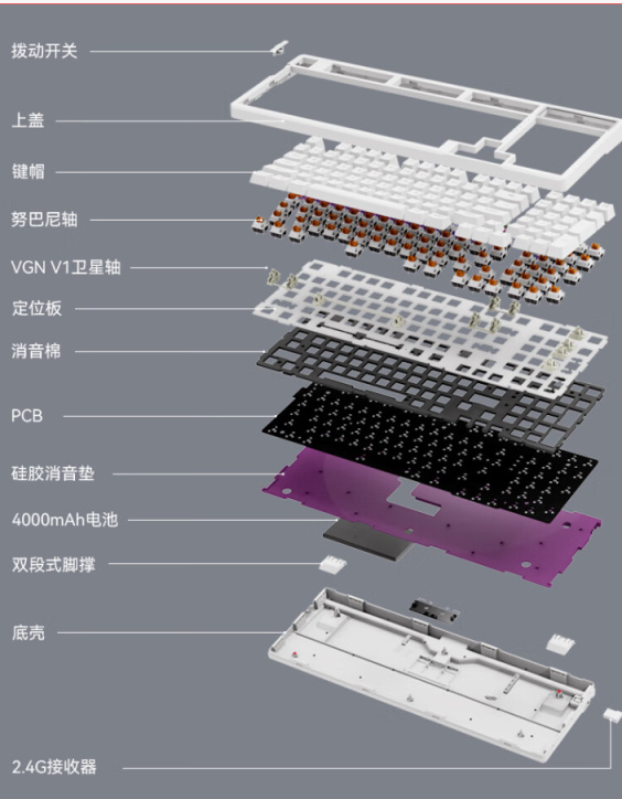 由于这个键盘之前非常的火,网上拆解图很多,加上快过年了,这次我就不拆了,直接用官方图说一下吧。