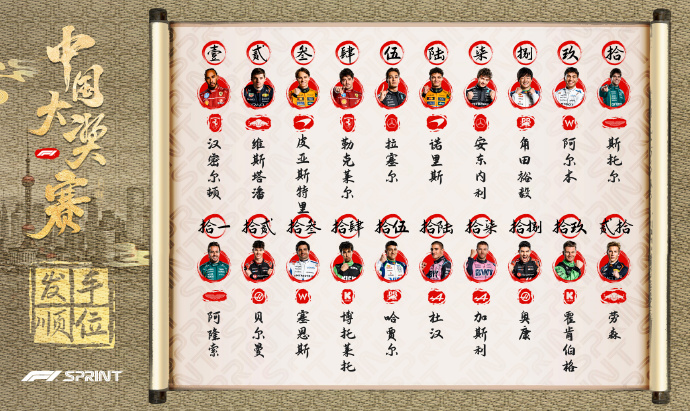 今年是F1中國站連續第二年採用衝刺賽的新賽制,昨天進行了一練和衝刺賽排位賽,老漢代表法拉利奪得首個衝刺賽杆位,今天上午11點準時進行衝刺賽,前八名的車手將獲得積分,發車順位如下,老漢杆位,維斯塔潘第二、皮亞斯特里第三,樂扣老四,拉塞爾第五,諾里斯第六,安東內利第七,角田第八,紅牛車隊兩位車手差距最懸殊,勞森昨天因爲失誤排名第20。