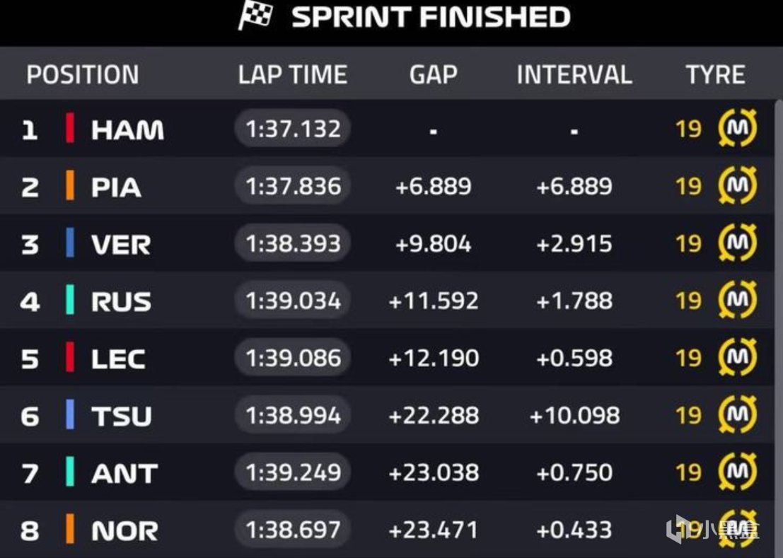 Lap19: 漢密爾頓衝線,拿下自己法拉利生涯的首個衝刺賽冠軍,皮亞斯特里第二,維斯塔潘第三!第四至第七名分別是:拉塞爾、勒克萊爾、角田裕毅、安東內利,諾里斯最終反超斯托爾,拿到第八!(與此同時,杜漢賽車直接Spin停在賽道中間,賽後頒獎嘉賓爲中國明星、賽車愛好者林志穎)