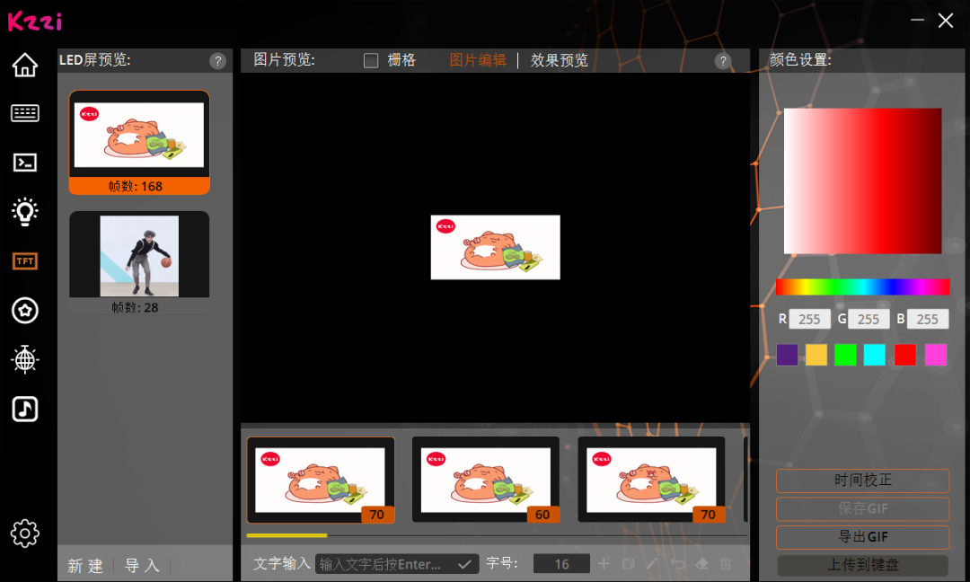 驱动这里啊我只能说是做的真的很一般,我不想多说,珂芝的驱动能用就行其实,嗯,但是这个gif图片是支持一个一百多帧的,这个有意思啊,正常情况下了来说一秒是24帧,也就代表着我们可以放一张7秒钟的gif在上面,这里是不错的。