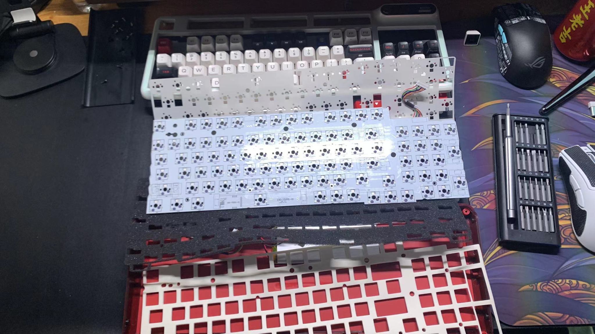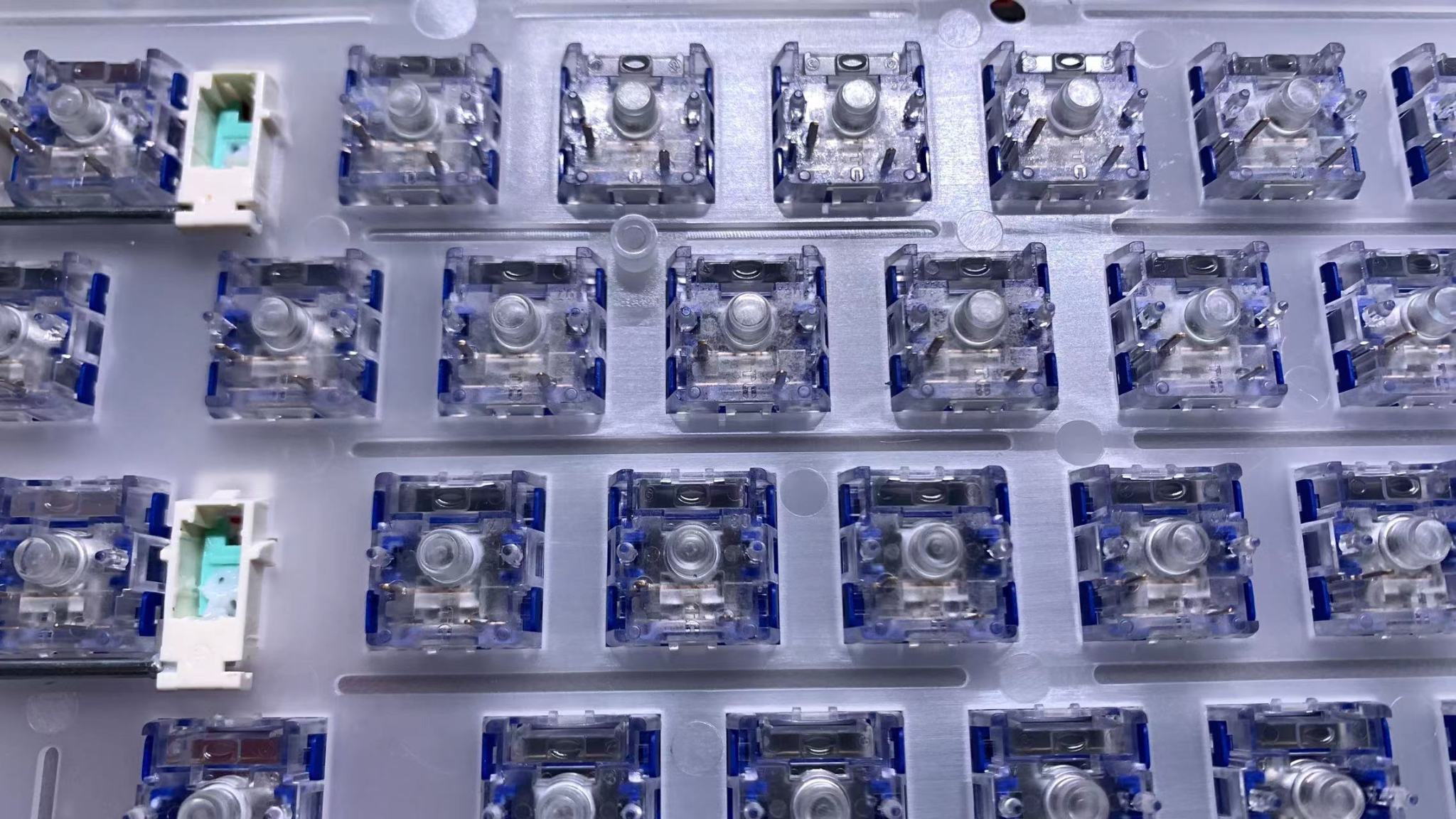轴下垫之部分,对其卫星轴也有单独的开槽,这里是不错的,材质是一个ixpe材质的轴下垫,轴下垫的主要作用就是让轴体底部与pcb之间的空隙减小,进一步消除空腔音,以及起到一个优化声音的作用。