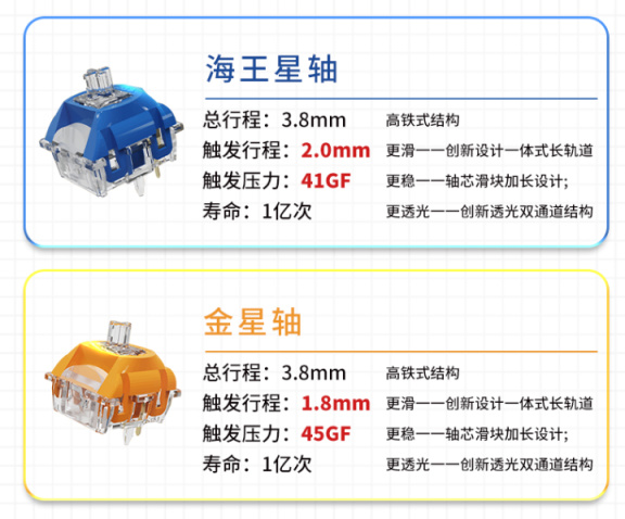轴体方面我这里选择的是海王轴啊,因为金星轴我在之前的那把键盘上面其实是有的,之后我这把键盘就选择了海王轴,这样我也可以跟你们说一下实际的感受啊,海王轴啊是一款提前触底的轴体,金星轴呢是一款提前出发的轴体,如果你喜欢打游戏触发快一点的话,那我建议你去选择金星轴,从声音表现来说,进项轴的表现是比海王轴好的,这个是我自己的判断可能会纯在误差,这里你们要注意一下;但你们如果想要一个打字手感轻的话,那就直接选择海王星就行。