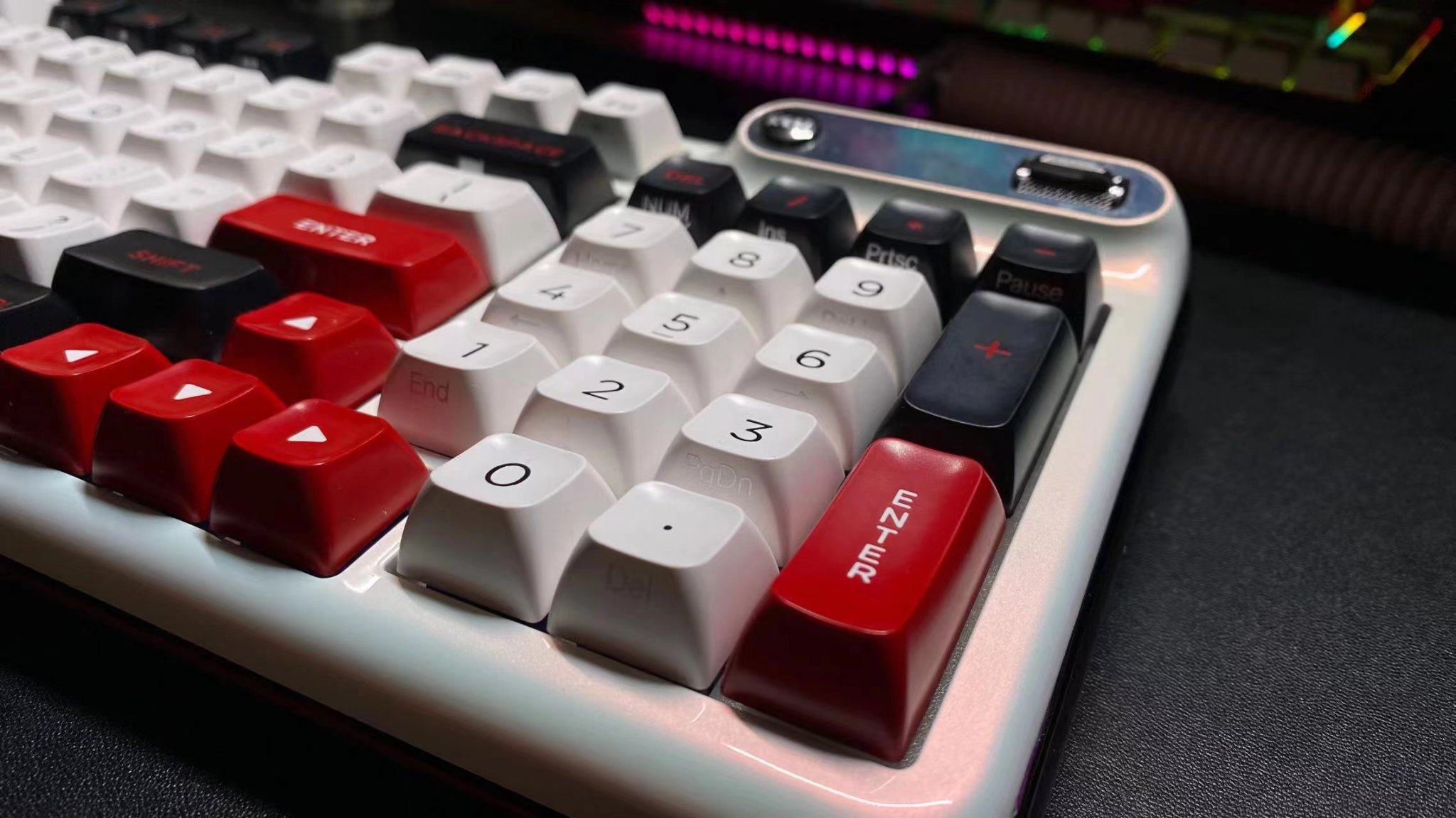 首先来看键盘数字区域,由于键盘的小屏幕遮挡住了键盘的功能区,导致了键盘的del之类的功能键没有了,所以呢这里了侧刻的印刷,让你可以通过快捷键的方式进行使用(但是有一说一吧,像我打游戏的时候地图取消标点如果让我用组合键的方式的话我觉得很麻烦的)