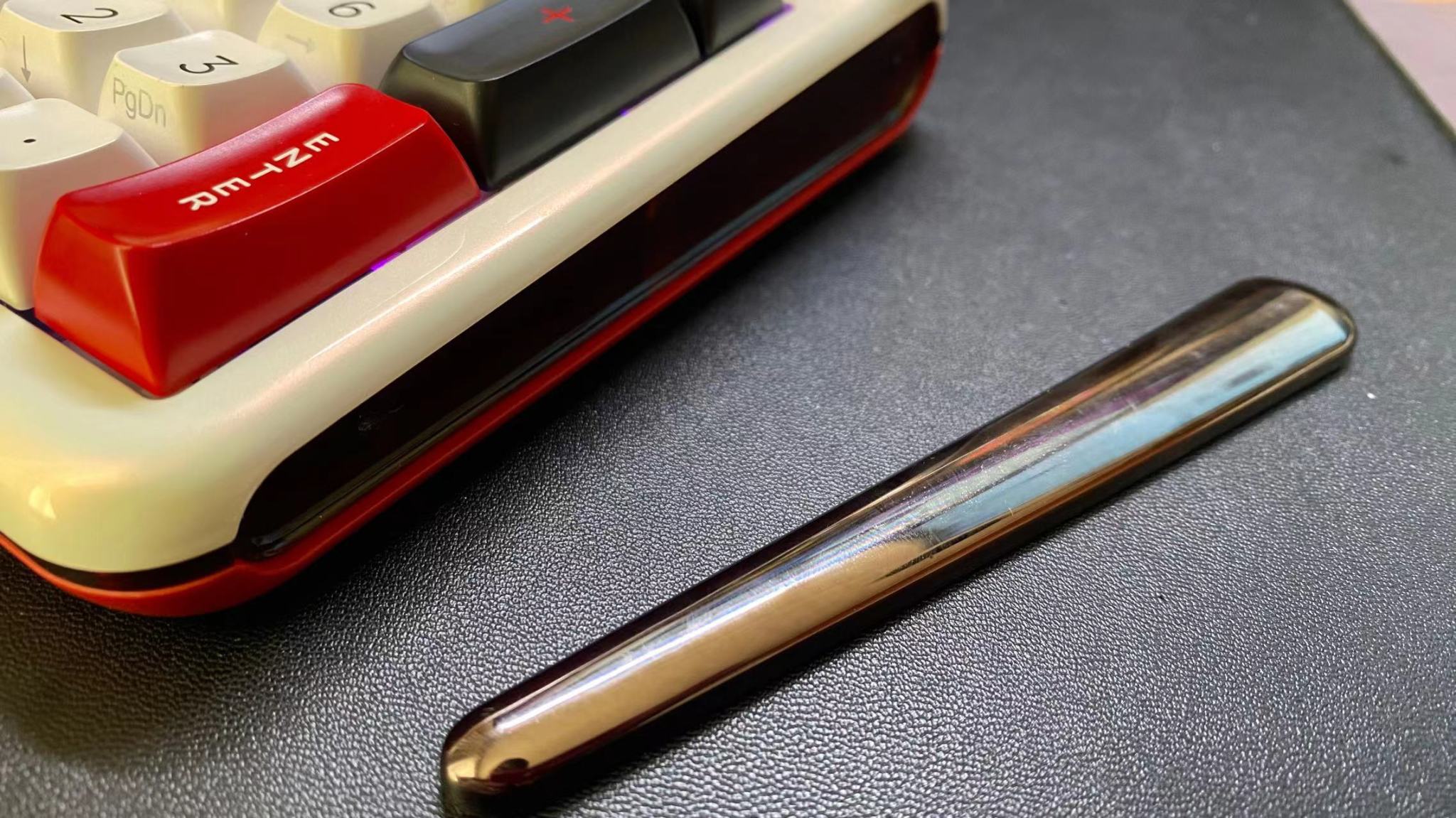 键盘侧边的装饰条是一个磁吸设计,这个啊我估计是可以让你自己更换的,但是啊,由于是磁吸上去的,摸起来还是有一定的移动空间