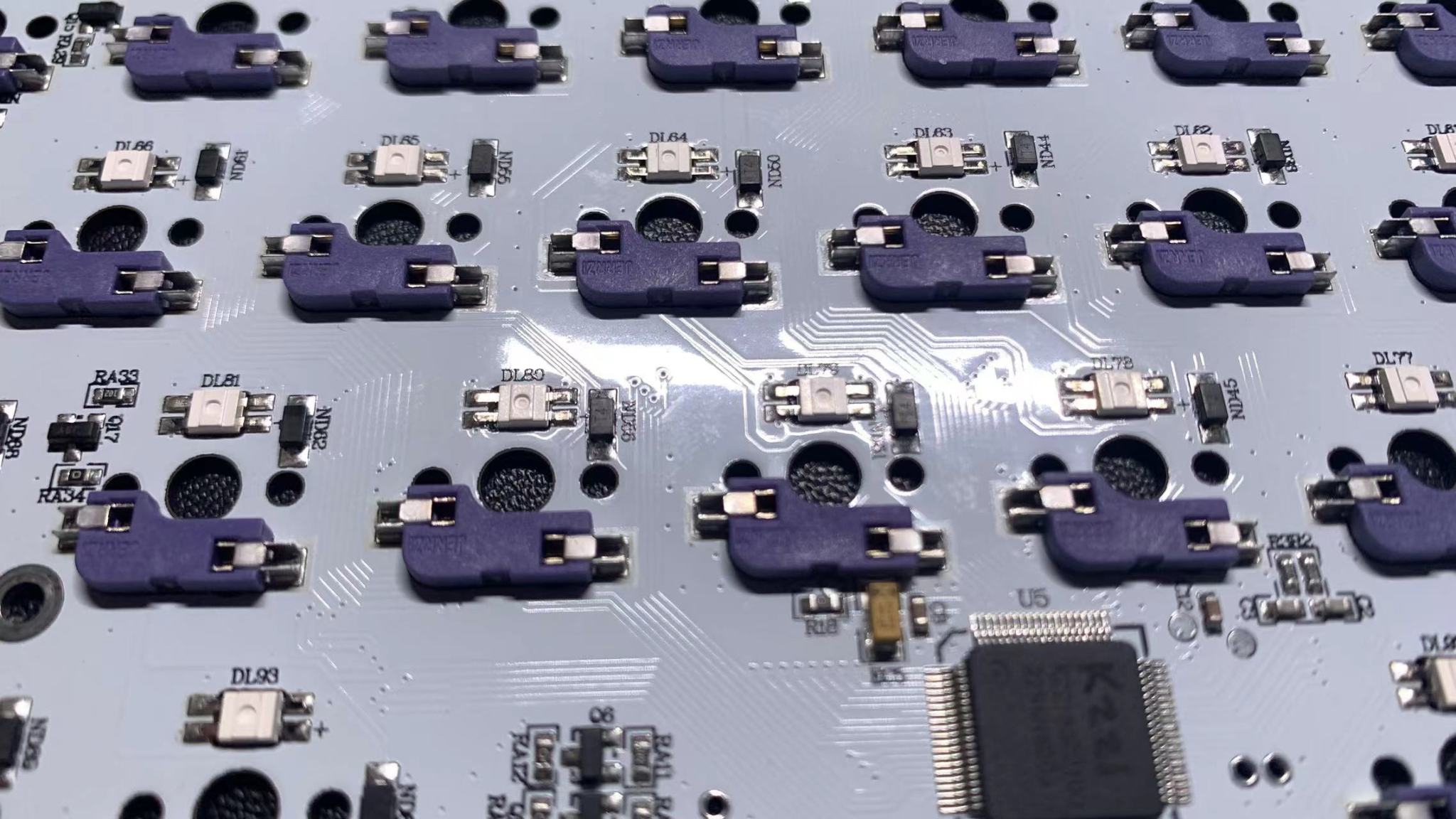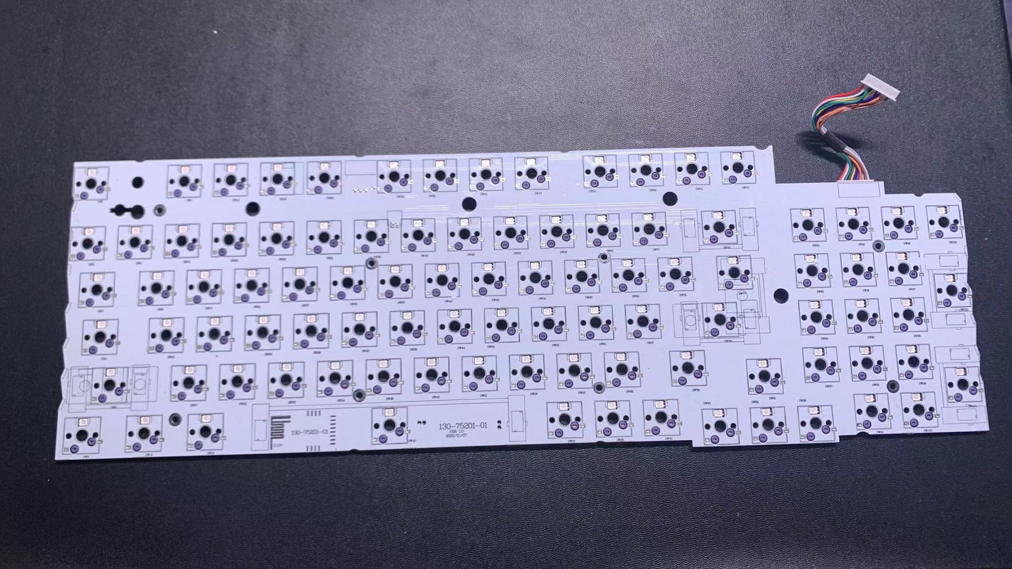 pcb这里是采用的是一个上灯位的设计,之后如果各位想更换侧刻键帽的话,这里我提醒各位啊,上灯位更换侧透键帽会影响键盘的灯光亮度