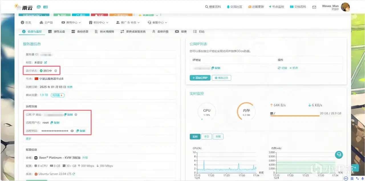 接下来你需要记下服务器的公网IP地址,远程用户名,远程密码。其中请切记不要将公网IP与远程密码泄露给任何人,避免造成损失。如果IP与密码不慎泄露,在本页面中还提供了”重置密码“与每月1次的更换公网IP的机会,本文中就不过多介绍。