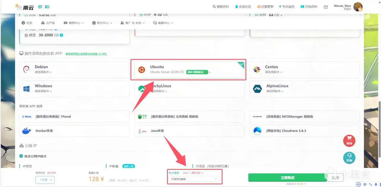 首先系统选择”Ubuntu>>Ubuntu Server 22.04 LTS“,预装APP可选 1Panel。这里以没有选择为教程基础