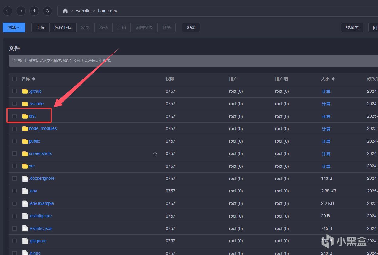 接下来在这里前往你的home所在路径“/website/home”,进入home下名为“dist”的文件夹内。如果你前面没有执行pnpm build是没有这个文件夹的