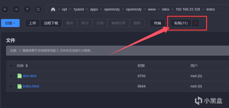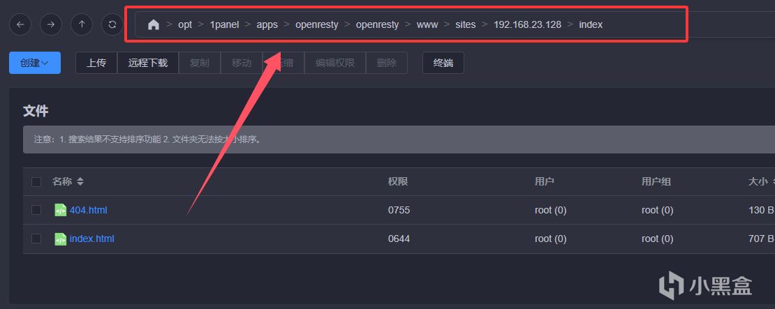 点击一下最上面的路径,把它完整复制下来备用,例如我的是“/opt/1panel/apps/openresty/openresty/www/sites/192.168.23.128/index”