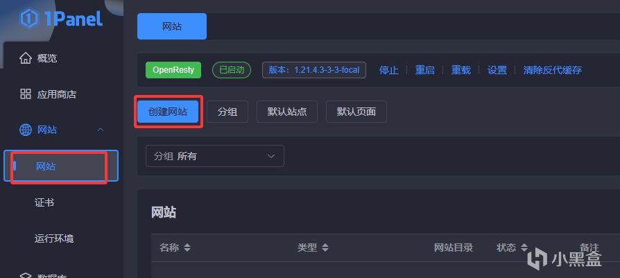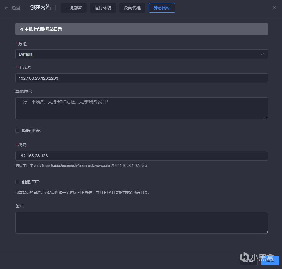 回到1Panel,打开 网站>>创建网站>>静态网站