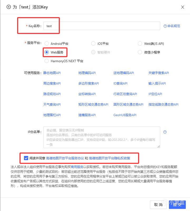 按自己喜好输入Key名称,选择“Web服务”,勾选同意协议提交即可