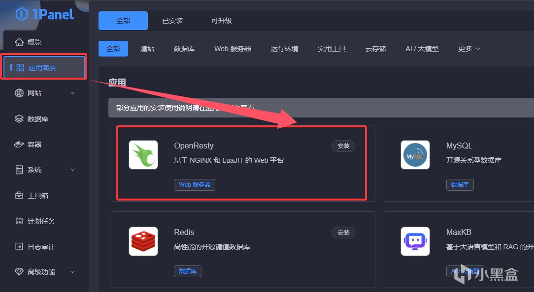 接着登陆1Panel面板,打开 应用商店>>安装OpenResty 1