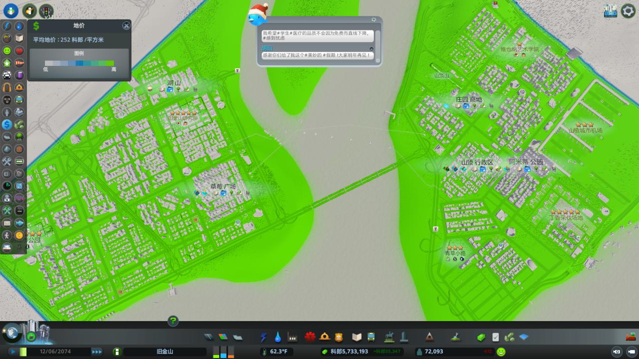 作用2:提升全图范围之内的地价(地价有什么用?高地价会使几乎所有建筑都将在游戏时间的几周内达到最高等级,这会增加税收收入、带来新的市民、拉动旅游业发展。不过问题也在这里,人口一下子过多又会在大约两年后迎来死亡潮)