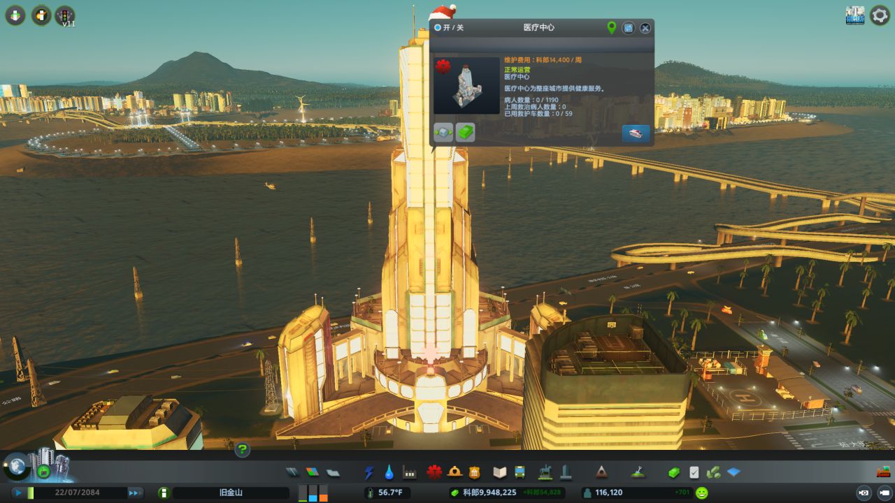 作用:可以接受全图的病人进行治疗,之后,如果在一个规划合理且干净卫生的城市中(市民与任何污染分离,包括噪音污染),生病的市民数量将降低至零,街道上再也没有救护车,平均健康度达到 100% 。