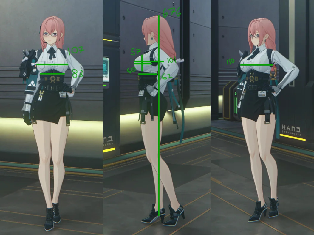 其实就是把官方的人物模型导入到建模软件中,根据角色的身高设定和比例进行像素测量,再借助各种数学工具将之转化成现实里对应的各项数据,充满了大量数学计算过程,几乎没有什么让人脸红心跳的刺激可言。