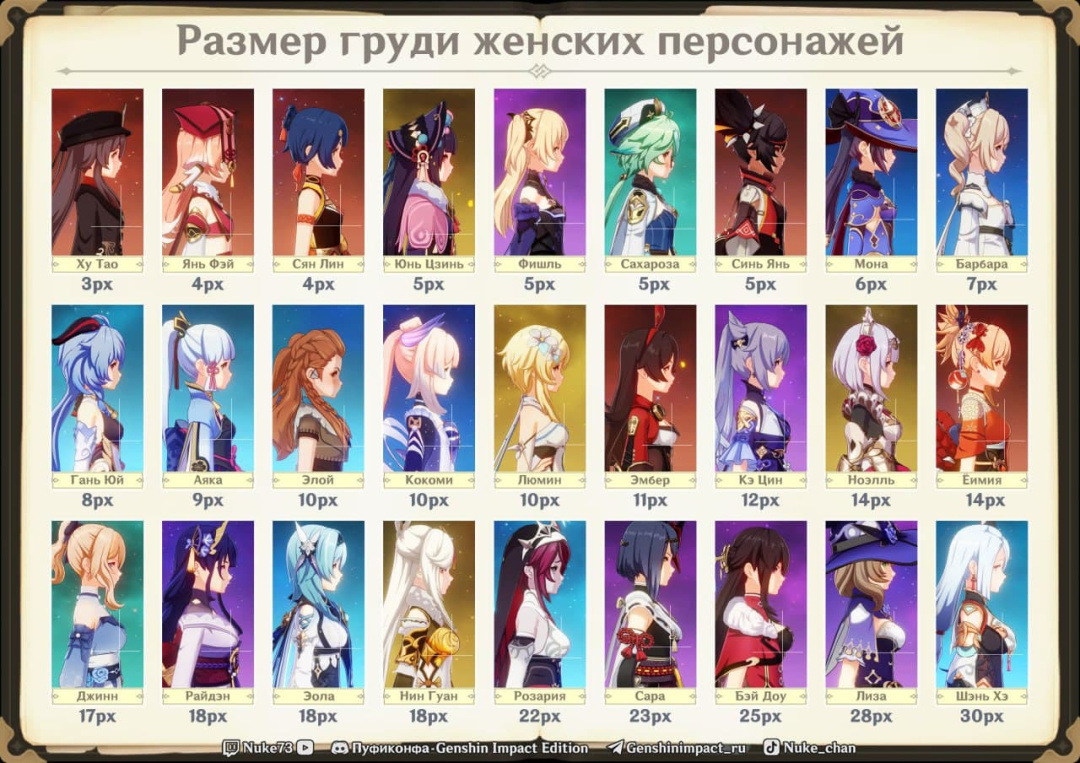 起码三年多以前,Reddit上就出现过一位一眼顶针的俄语区网友,用像素级视力测量并列出了《原神》各个女角色的胸围排行榜。同时期国内的LSP也使用相同的技术路线进行了类似的测算,并借助游戏内机制将之准确换算成了现实中的各项数据,此时得出的结果已经具备相当的准确度和权威性,因此这一测算方法一直被沿用至今。