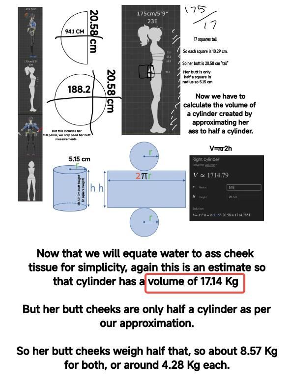 例如另一位Reddit老哥借用之前那份角色三围表单的数据和研究方法,计算出了女警朱鸢的屁股重量为8.57kg,并认为这一结果应该有80%的准确度。