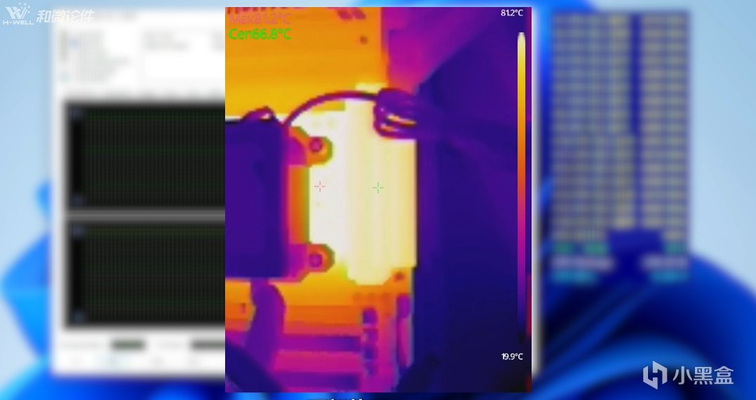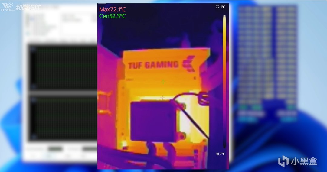 此時紅外測溫儀顯示供電區域最高溫度72.1℃,尾部散熱裝甲溫度只有52.3℃,頂部裝甲介於兩者之間;
