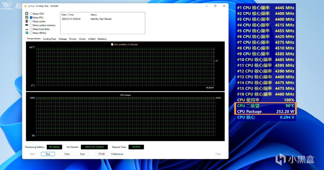 最後看下PBO狀態下的烤機測試,看看TUF B850M這款主板能不能抗住長時間的超頻使用,單烤FPU 10分鐘,核心溫度到達95℃溫度牆,功耗來到250W左右