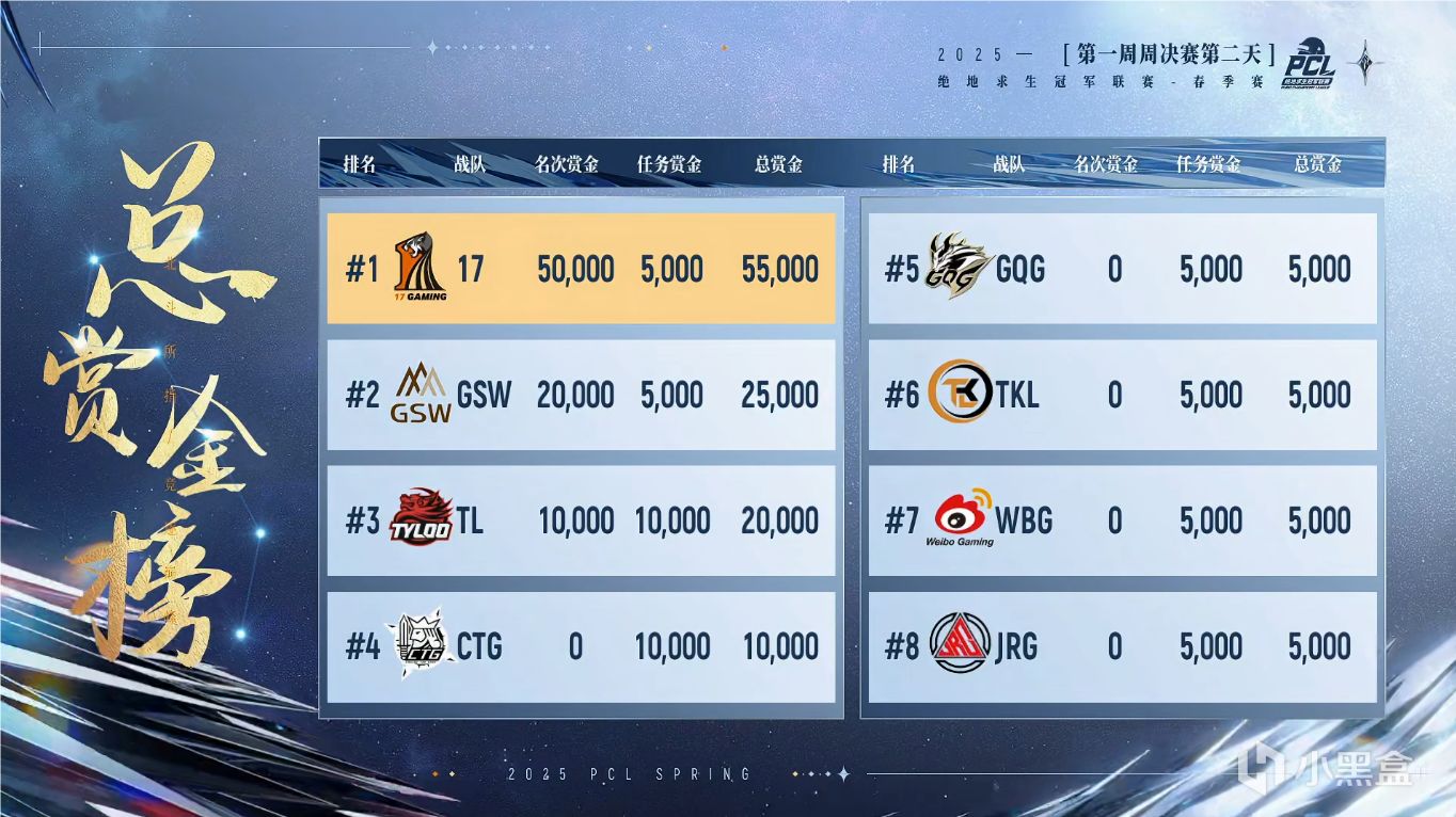 2025PCL春季賽第一週所有比賽都已結束,17Gaming以122總分獲得第1週週冠軍,單從排名上看有點小意外,GSW、TYLOO、NH等都通過局部場次的爆發提升了自己的排名,賽前被看好的PeRo、CCG等銀河戰艦相對來說略顯遜色。