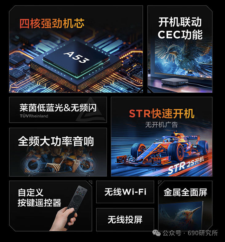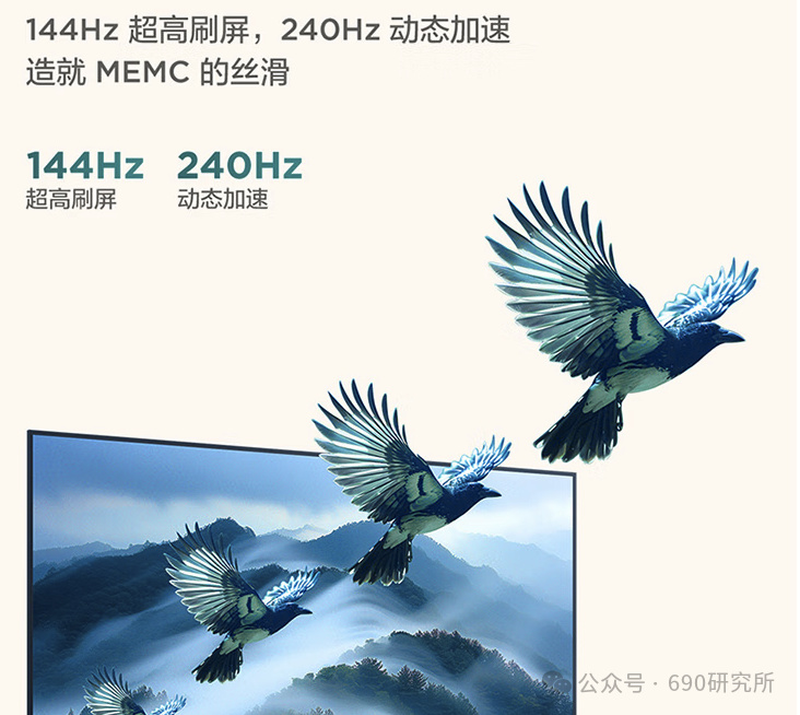 青鳥75吋版本核心配置上採用4K 144Hz VA面板,支持240Hz動態加速,93%的P3色域覆蓋,色準ΔE≤0.99,雖然不是MiniLED技術,但這樣的配置也是完全夠用。(沒用MiniLED主要還是因爲MiniLED面板很難做薄,難以降下成本)
