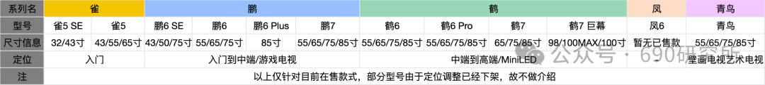 雀部分稍大尺寸的版本其實跟鵬入門款是有重疊的。像雀5 55寸和65寸的版本其實跟鵬的55寸和65寸版本系列產品有所重疊,價格上兩者也比較接近,但是在覈心配置上還是鵬的要更高一點。