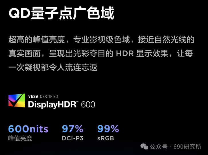 哦對,勘誤下這個是QD-MiniLED,多了一層量子點膜,在色準、色域覆蓋方面表現要更好一些。在這臺Q6上就做到了97%的P3色域覆蓋,99%的sRGB色域覆蓋,在遊戲之餘還是一臺表現非常優秀的辦公顯示器。