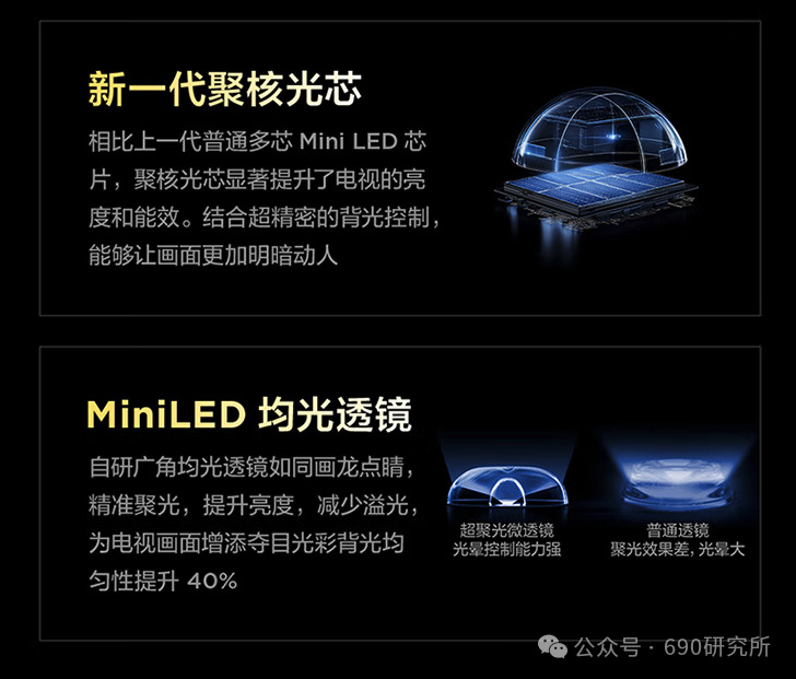 關注MiniLED的朋友肯定是知道的,MiniLED電視想要顯示效果好,不能只看背光分區多少,特別是光暈等情況,用到的透光鏡也是影響實際效果的一個很重要的因素。