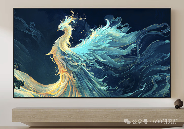 既然是藝術電視壁畫電視,那顏值方面當然不能差。青鳥機身厚度僅只有29.8mm,可以採用隱藏式走線+嵌入式的國畫家,這樣掛在牆上能夠實現“無縫貼牆”,再加上97%的屏佔比,就光一個外觀來說顏值真的無敵了。