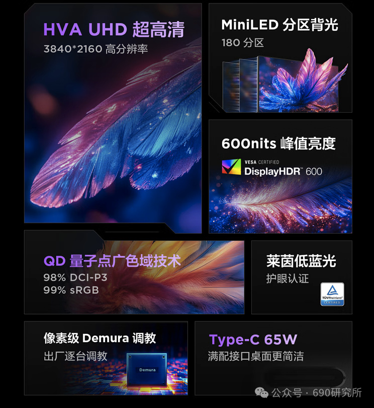 U6的特點很突出,4K分辨率,180級MiniLED背光分區,ΔE<2逐臺校色、98% DCI-P3色域,支持HDR600,這個配置放在一千出頭的4K辦公顯示器上還是很亮眼的。