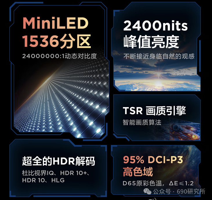 25款的鶴6可謂是升級點滿滿,我們來看到MiniLED電視的核心配置上。85寸的背光分區達到了352個,峯值亮度方面1300nits,支持覆蓋94%的DCI-P3色域,內置TSR畫質引擎,顯示畫面更加細膩。