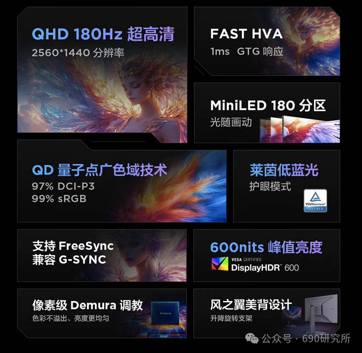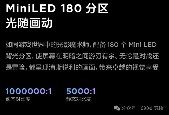 詳細看到Q6的配置方面,千元配置180級背光分區,在這個檔位上還是獨一檔的存在。動態對比度能夠做到1000000:1,靜態對比度也有5000:1,這個表現已經比很多IPS顯示器好太多了。