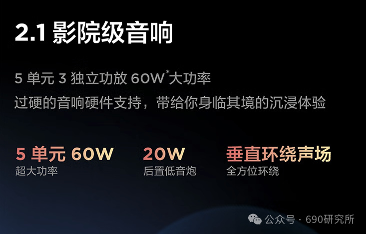 音響方面同樣十分給力,2.1聲道,5單元60W大功率揚聲器,支持杜比全景聲以及DTS:X,咱說實話,這個配置家裏都不用買回音壁了,就用電視音箱只要不是發燒友就已經是完全夠用了。