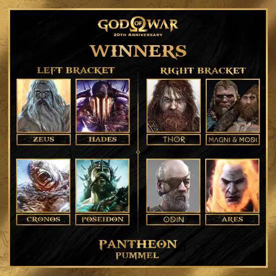 今日,索尼聖莫尼卡工作室通過其官方推特賬號,正式公佈了《戰神》系列20週年慶典活動——“萬神殿之戰”(Pantheon Pummel)的票選最終結果。這場盛大的活動吸引了全球範圍內衆多玩家的熱情參與,共同見證了《戰神》系列歷史上一次難忘的角逐。