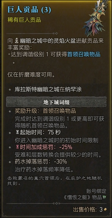 當我們擊殺boss時,有幾率會獲得巨人貢品,此時我們可以前往納罕圖,向幽暗之城的火盆中使用巨人貢品,來快速刷取boss召喚物