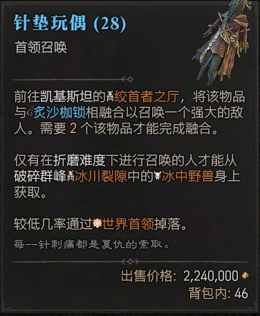 擊殺冰川巨獸也可以獲得針墊玩偶(安達利爾召喚物之一)
