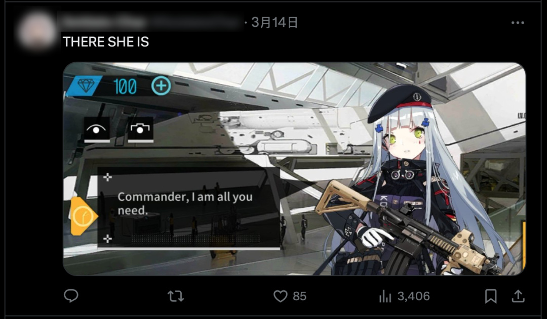 而HK416那句“指揮官只要有我就夠了”的臺詞,也戲劇性地從最初對槍械卓越性能的自信宣言,逐漸被玩家解讀爲對指揮官的佔有慾、到了《少前2》可露凱又回到了對強度清晰的自我認知。