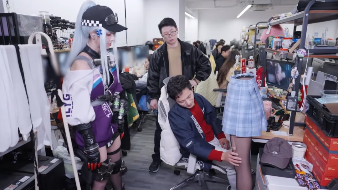 不僅如此,Coser還以實地探訪散爆公司的接地氣方式,將新版本的主要內容和幕後故事娓娓道來。參觀散爆的手辦牆,提醒玩家關注線下活動;觀摩設計師手撕絲襪尋找靈感,引出新的衛星皮膚;通過模仿表演動作,分享角色設計的思路,諸如此類,把整活環境與信息量傳遞巧妙融合。