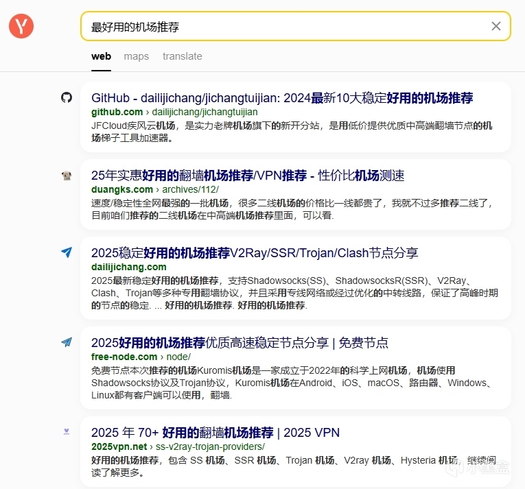 這個搜索引擎可以理解爲低配谷歌,從搜索結果的文章內挑個順眼的即可,價格從每月幾塊錢到幾十塊不等。不推薦購買長期,防止跑路。