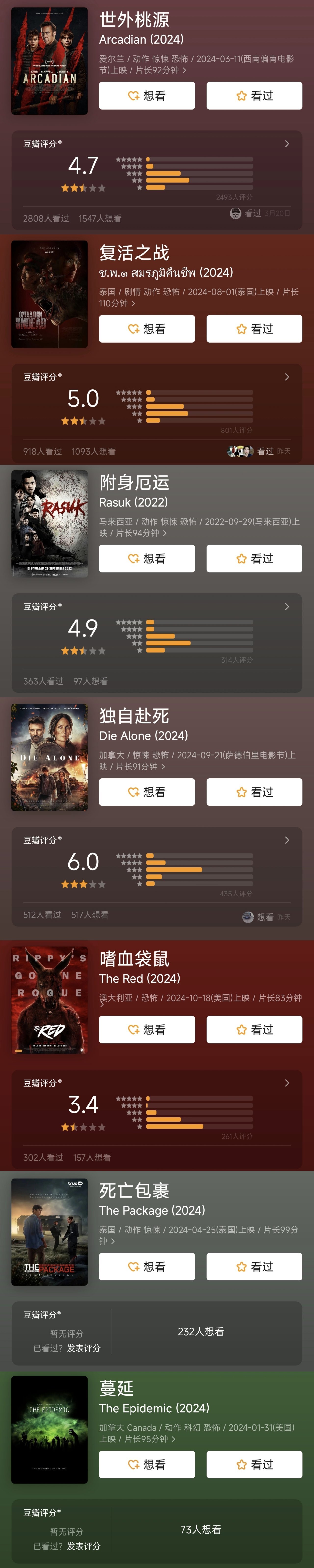 2024年是毋容置疑的恐怖片大年,全世界對恐怖片的需求正在躍升,相應的,也有越來越多的恐怖片被製造出來。喪屍片是恐怖片的一個子類型,雖然看上去好像很有名,但實際上由於天生的成本問題,實際上製作稍微精良能看的喪屍片多年來也都還是隻有那些。還有許多喪屍片只是以喪屍爲元素,實際上更多表達的不是傳統喪屍片類型的主題,而是愛情變調或者喜劇變調。下面我會列出2024年我沒有看也不打算看的其他喪屍片,感興趣的大家可以自行查看,可能不夠完整,歡迎評論區補充。