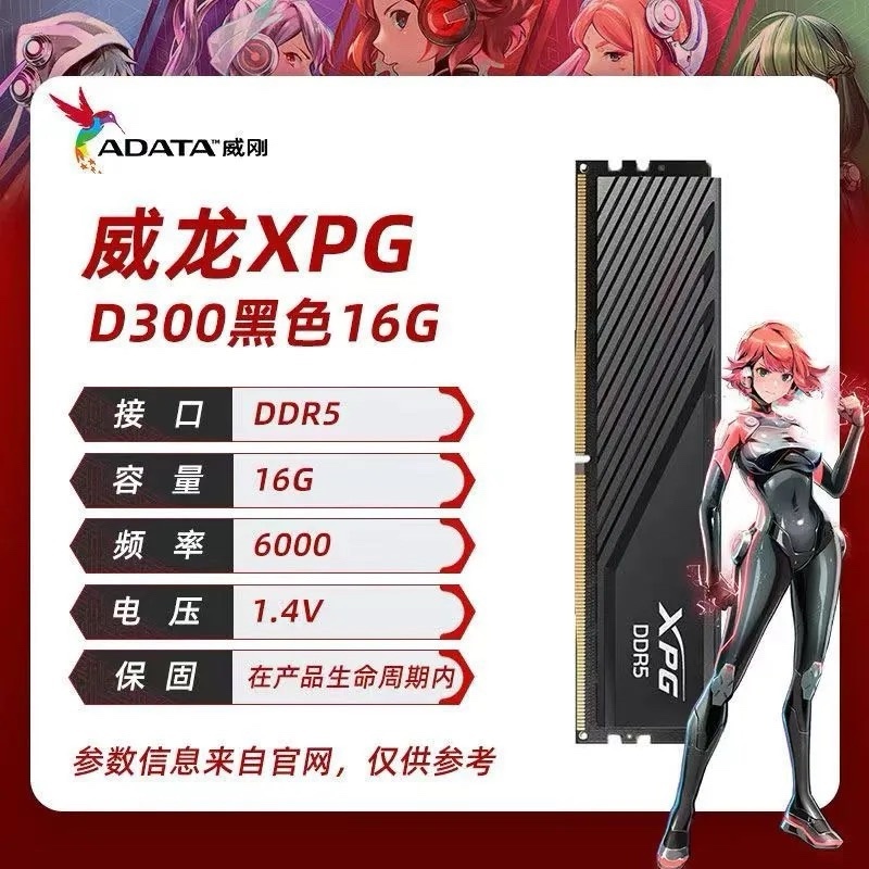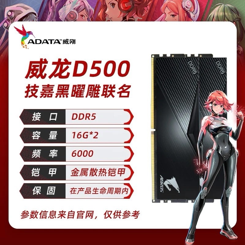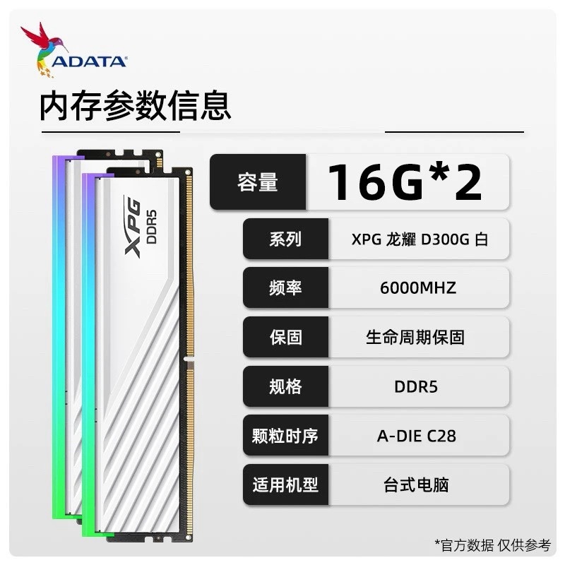 威剛兩款內存,d300龍耀和d500技嘉黑曜雕聯名,兩款都是馬甲條,d500技嘉主板優先選擇,在技嘉主板有一健超頻。d300不是c28低時序的內存,c30自己壓就行,顆粒等級不低,要注意別買a-die。同樣都是有白色和黑色,d300g是燈條。