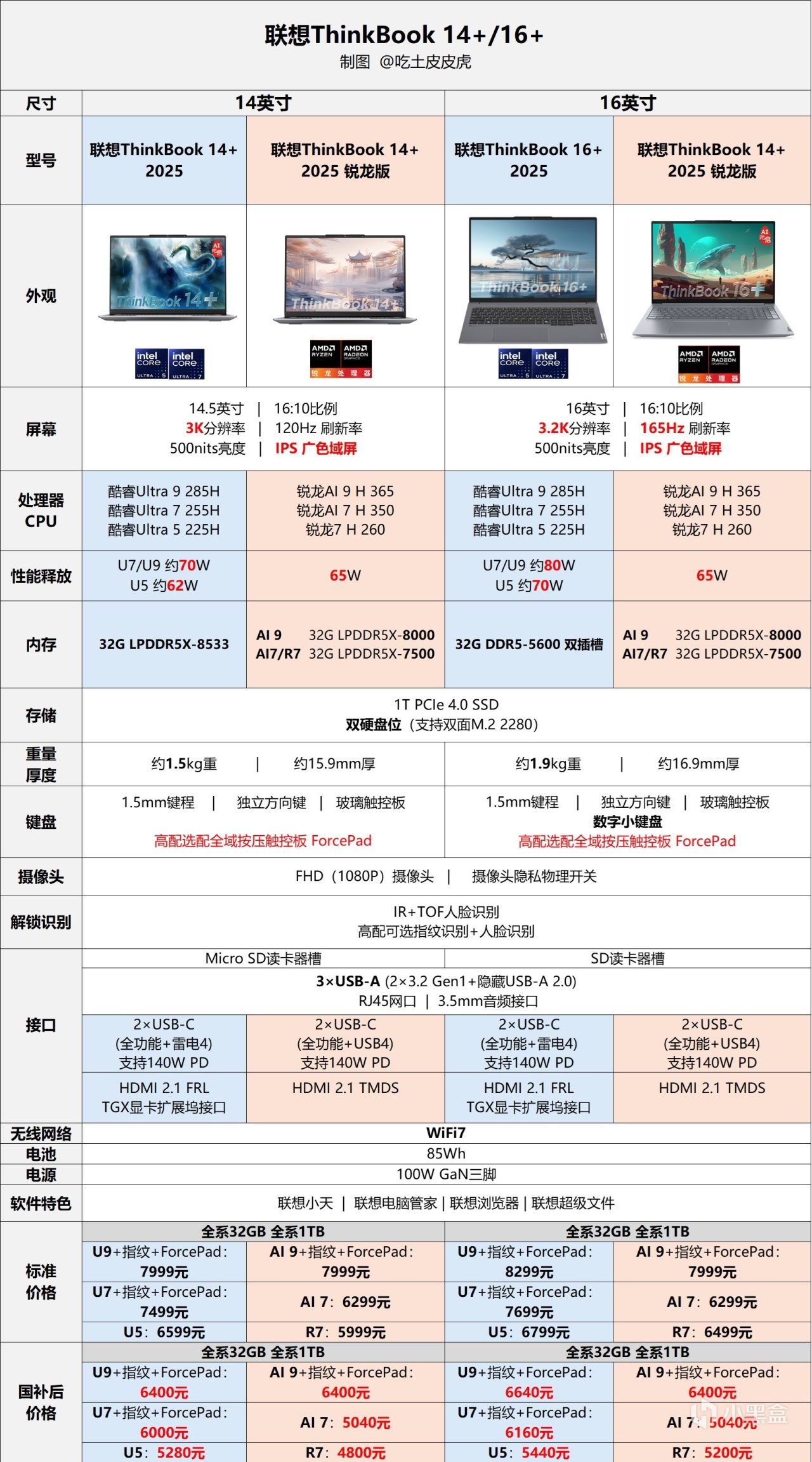 拉了一下2024煥新款、2025煥新款、2025款、2025Pro款、ThinkBook 14+酷睿的對比表,大家按需參考——