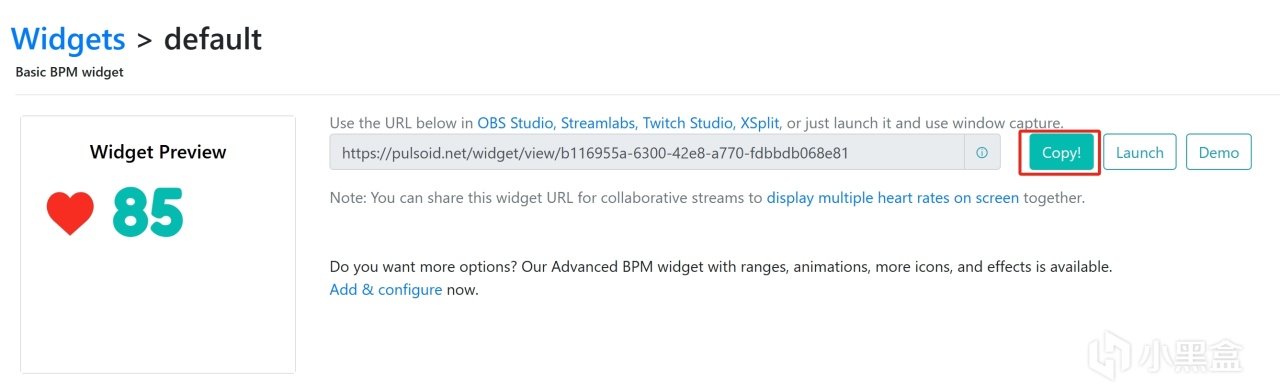 登陸Pulsoid網頁端,找到"Widgets"(登錄後顯示首頁的話,先點擊"Dashboard"),選擇樣式並點擊"Configure"。