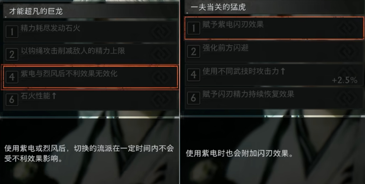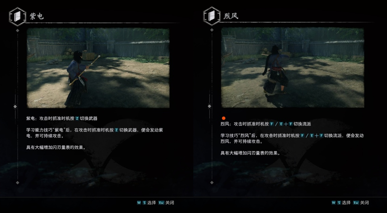 本作中玩家可以同时装备三种流派两把武器,切换流派的动作称之为“烈风”,切换武器的动作称为“紫电”,烈风和紫电打肉时都能大幅积攒闪刃量表。