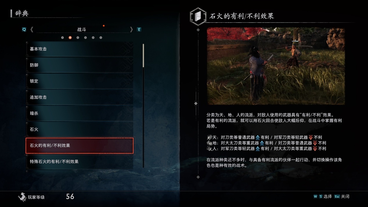最明显的是,本作的流派是有优势、均势和劣势流派之分的,劣势流派下(除了忍流派)即使成功石火连段也完全无法产生动摇效果。