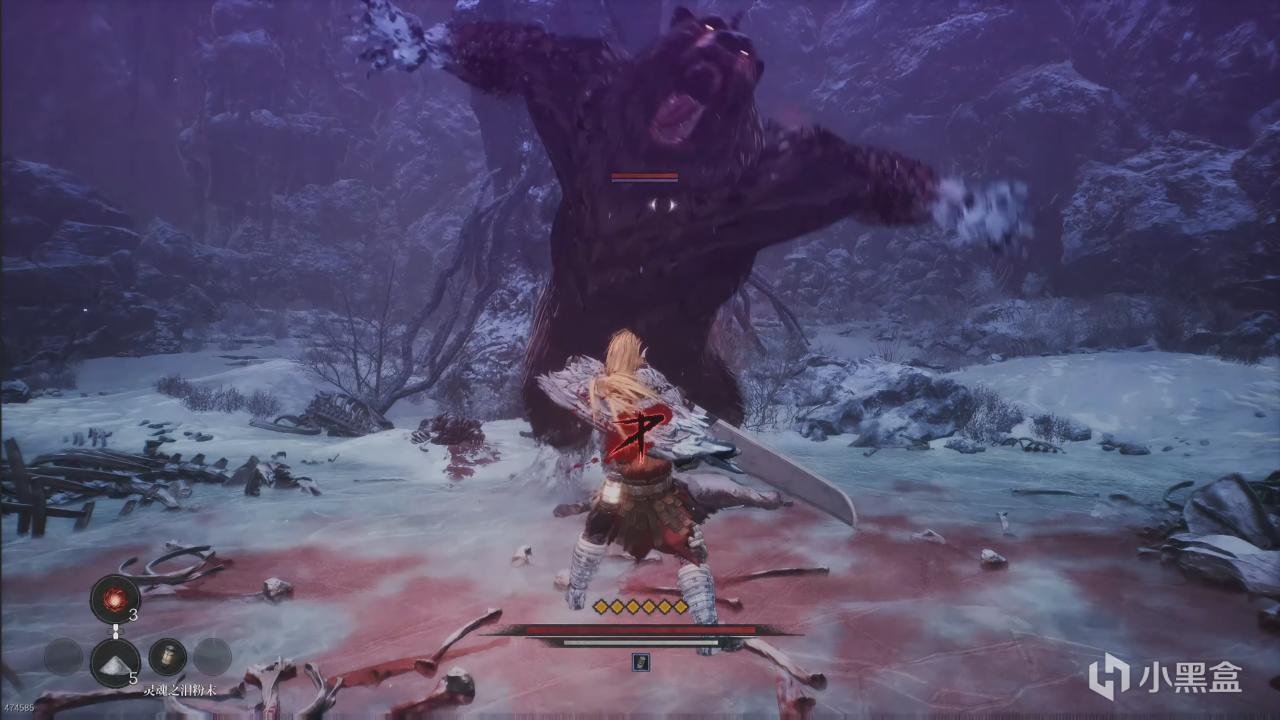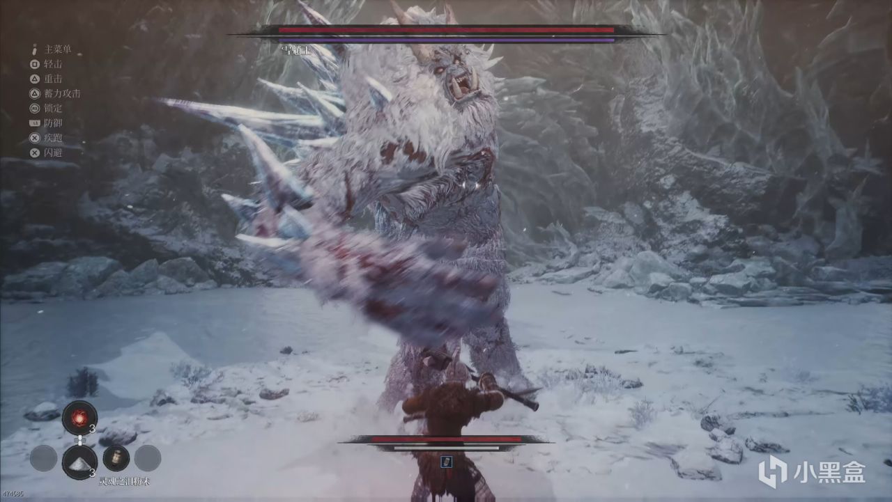 然後再說一下boss設計,目前這個試玩版給大家拿出來兩個boss打。兩個boss我認爲都是很好的設計,交互感滿滿。第一個boss雪魈王,屬於中大型的boss類似赤鬼。打起來也有幾分赤鬼的感覺。體型雖然偏大,但是動作都是一招一式的。給你很多完美彈刀的空間,打起來大開大合很有交互感。並且身上還有部位破壞打壞,打他背後的冰刺還會進入較大的硬值讓你輸出。我玩的時候出現了很好笑的一點,由於玩的比較急沒有認真看攻略。再加上他的處決鍵是單獨一個鍵位,導致每次打出硬值我都是隻會平A輸出。所以爲什麼處決鍵要單獨設計一個鍵位呢?這點有點反直覺需要適應一下。