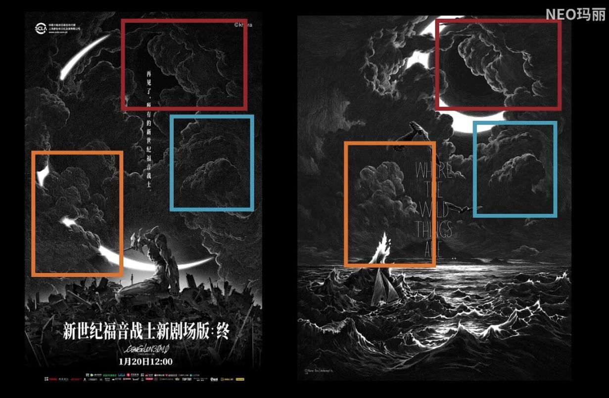 根據EVA解析研討組織【粉紅獅鷲Z】的B站賬號NEO瑪麗指出,這張海報在構圖上抄襲了加拿大籍法國插畫師Nicolas Delort的作品,二者經過細節對比,高度相似,甚至畫面裏很多素材都是直接複製粘貼,改都沒有改。